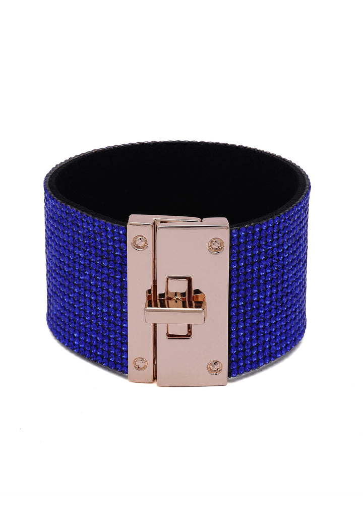 Wrap your wrist in pure diva energy. This wide leather cuff is drenched in blue crystals, creating a royal blue shimmer that feels straight off the red carpet. Lined with soft suede and finished with a sleek, high-polish clasp, it’s a bold, luxurious statement piece for nights when you want all eyes on you.