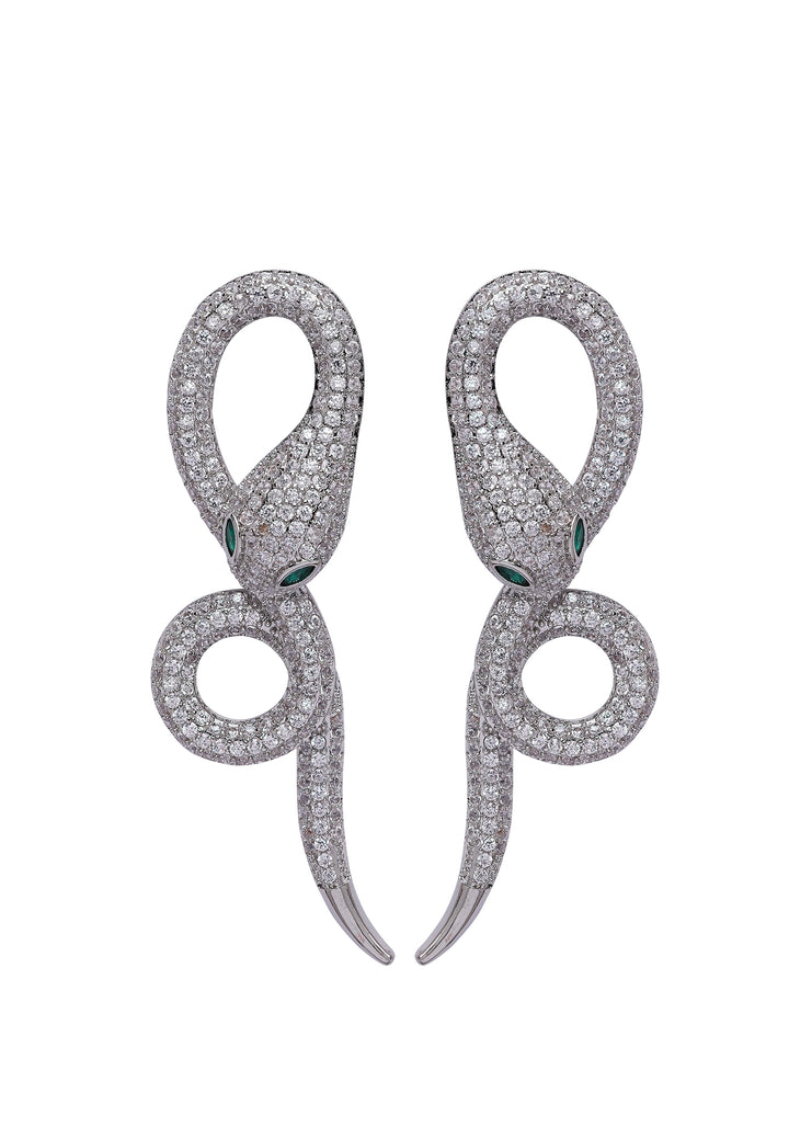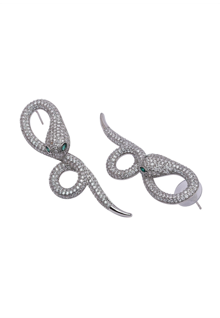 Diva Serpent Ear Cuff is a Striking piece of ear ornament. These earrings are from the Diva collection. These earrings are from the Diva collection. The serpent's body is encrusted with shimmering cubic zirconia stones, adding a dazzling sparkle that enhances the luxurious feel of the piece. As the serpent coils around the ear, its body tapers off into a tail that elegantly rolls up, creating a sense of movement and fluidity. The sleek silver finish complements the glittering cubic zirconia, ensuring the ear cuff is as a unique and eye-catching accessory. Whether worn for a special event or to add a touch of edginess to everyday attire, sure to draw admiration.