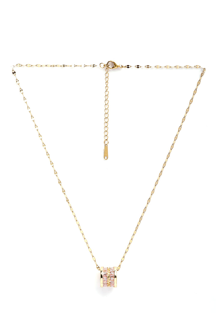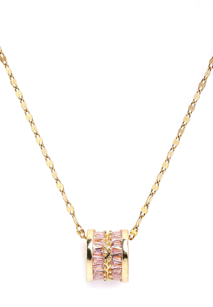 The Elegant Cylinder Inlaid Chain Necklace featuring a gold-colored chain with a pink cubic zirconia cylinder is an eye-catching piece. The focal point of the necklace is a small cylinder pendant, inlaid with pink cubic zirconia stones. This necklace is suitable for various occasions, from casual outings to formal events, adding a subtle yet sophisticated charm to any outfit. Wear it alone for a minimalist and refined look. This necklace is sure to be a standout piece, combining elegance with a touch of color and modern design.