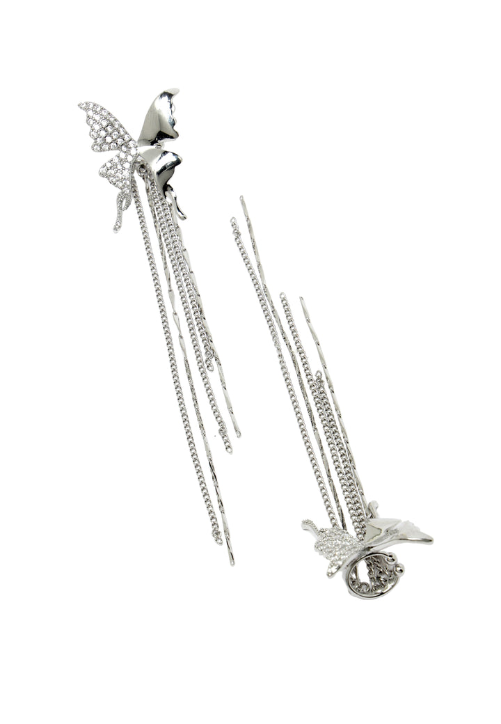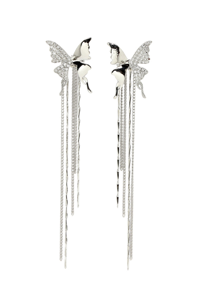 Ces boucles d'oreilles présentent un superbe motif papillon fabriqué à partir d'un élégant métal argenté. La forme du papillon est minutieusement détaillée avec des finitions lisses et texturées, lui donnant un aspect réaliste. Le corps du papillon est orné de cristaux étincelants. Le bas du papillon est décoré de pompons exquis qui, une fois portés, glissent avec fluidité et élégance. De minuscules accents de cristaux ont été ajoutés aux pompons. Ces boucles d'oreilles peuvent être portées avec une tenue décontractée. Les boucles d'oreilles en cristal papillon à pampilles argentées peuvent être superbes avec une robe de soirée ou une robe de cocktail. Ils peuvent ajouter un peu d’éclat et d’élégance à l’apparence générale.