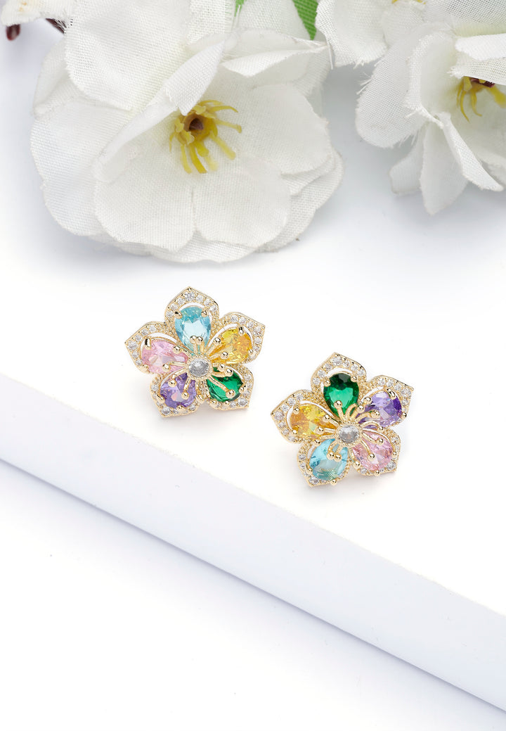 These playful flower stud earrings burst with a kaleidoscope of color. Each petal features a different vibrant gemstone hue, creating a charming and whimsical floral design. The sparkling crystal accents and gold-toned setting add a touch of glamour to these cheerful earrings.