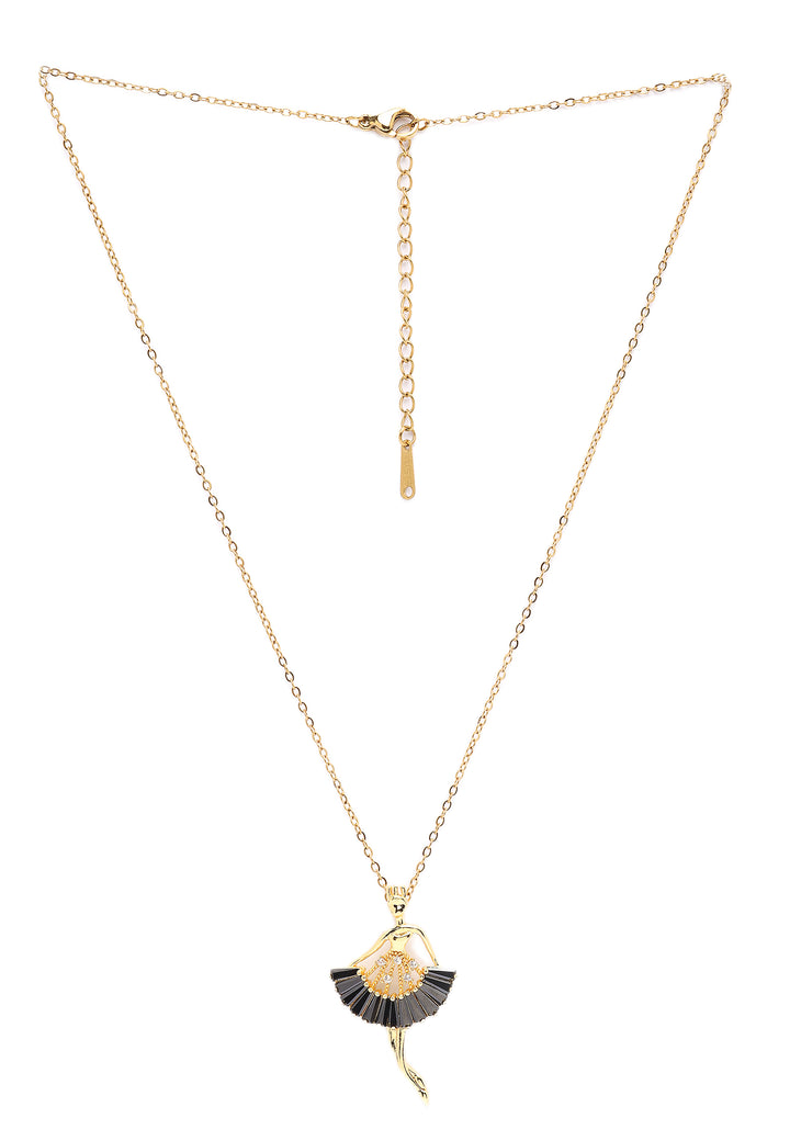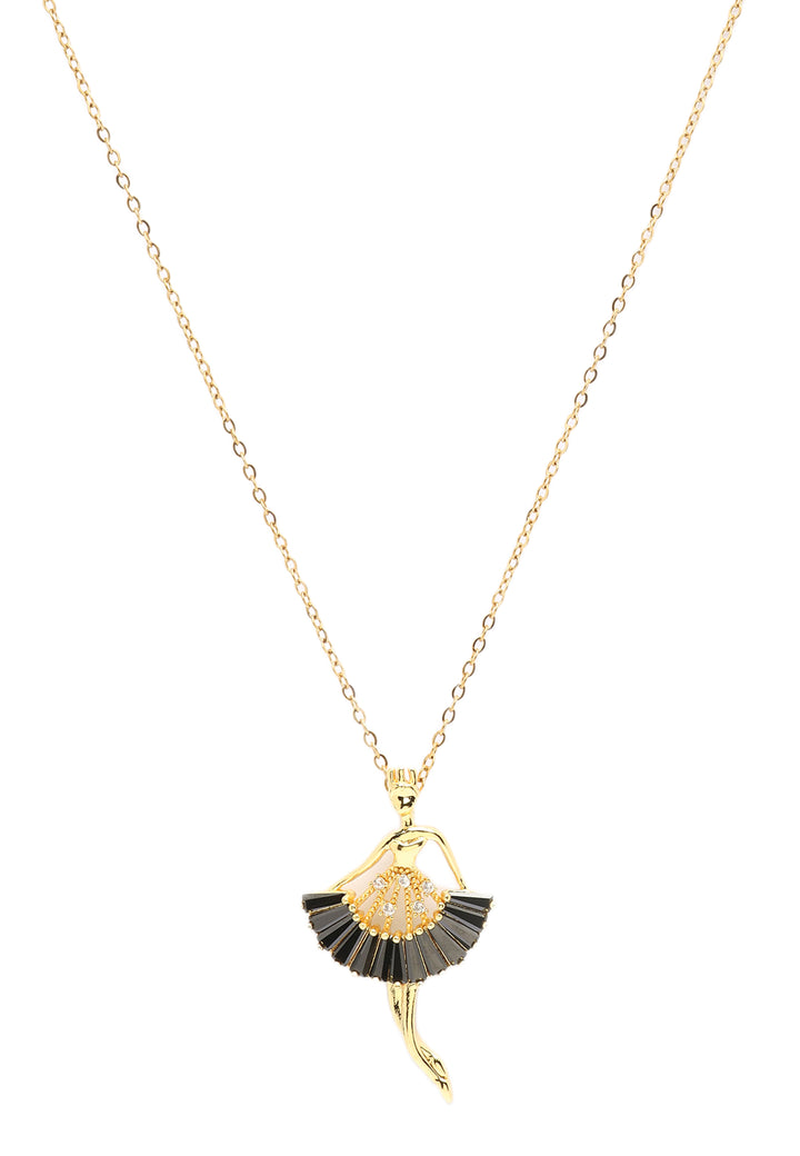 Un tributo straordinario all'eleganza della danza, questo pendente presenta una graziosa ballerina adornata con un fluente tutù in smalto nero. La figura dorata irradia fascino e arte, sospesa delicatamente su una catena in tono oro abbinata. Perfetto per ballerini, amanti dell'arte o chiunque apprezzi la bellezza del movimento, questo pezzo aggiunge un tocco unico e artistico alla tua collezione di gioielli.