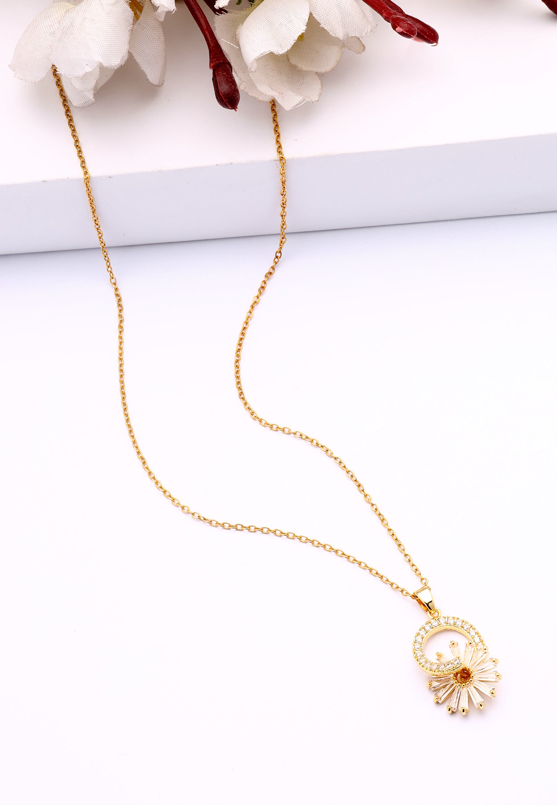 Promieniuj urokiem i wyrafinowaniem dzięki tej olśniewającej naszyjnikowi. Naszyjnik ma oszałamiający okrągły kształt ozdobiony błyszczącymi kamieniami, otaczającymi urzekający motyw promieni słonecznych, który emanuje ciepłem i blaskiem. Złote wykończenie dodaje luksusowego...