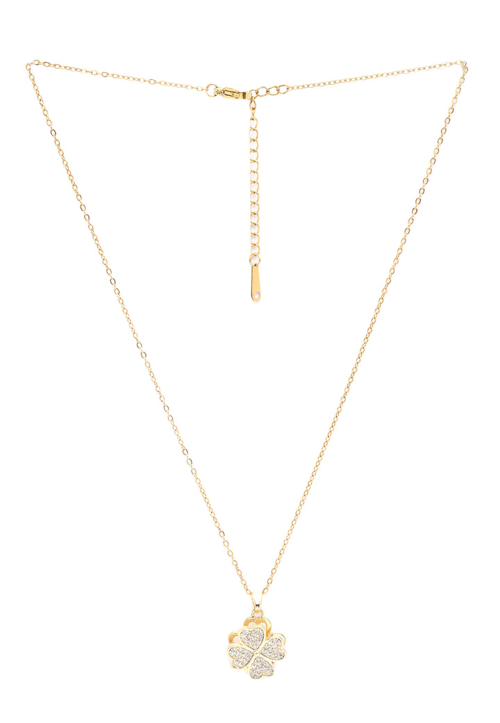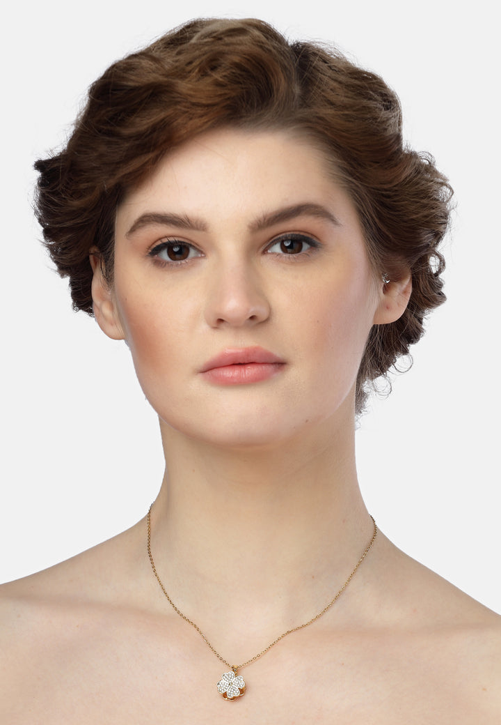 Este collar presenta un encantador colgante de trébol de cuatro hojas, incrustado con piedras brillantes que destellan con cada movimiento. El colgante descansa sobre una delicada cadena, lo que lo convierte en el accesorio perfecto para el día a día, añadiendo un toque de suerte y brillo a tu look.